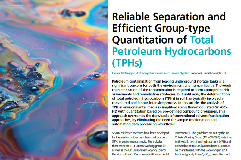In this article, the analysis of TPH in environmental media is simplified using flow-modulated GCxGC–FID with quantitation based on pre-defined compound groupings. This approach overcomes the drawbacks of conventional solvent fractionation approaches, by eliminating the need for sample fractionation and automating data processing workflows.