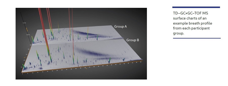 TD–GCxGC–TOF MS was used to capture nine comprehensive breath profiles from two groups of participants, with the goal of identifying compositional differences between the two groups. ChromCompare+, a powerful data mining and chemometrics platform, was used to automatically find significant differences between sample classes in the resulting complex datasets.