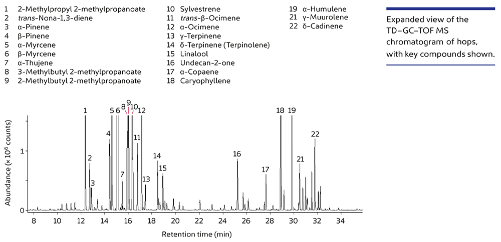 The sampler was a Micro-Chamber/Thermal Extractor from Markes International, which allows up to six samples to be taken simultaneously at elevated temperature for faster sampling. The use of Tandem Ionisation provides enhanced confidence in the identification of terpenoids, while the comparison of hop varieties is simplified by real-time data-processing in the accompanying software package.