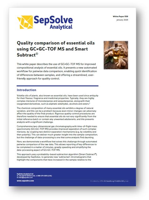Ensuring the quality of essential oils is crucial, as even minor variations can impact their aroma, efficacy, and commercial value. This study demonstrates the power of GC×GC–TOF MS and Smart Subtract®, an automated data comparison tool, in analysing essential oils. By highlighting compositional differences between samples in minutes, this approach simplifies quality control and authenticity verification.