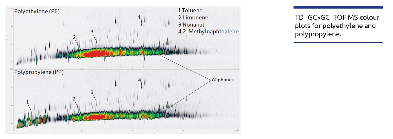 This study demonstrates the use of a discovery platform combining thermal desorption with GCxGC–TOF MS for comprehensive screening of emissions from plastics. The platform was used to uncover ‘hidden’ compounds that would have been overlooked using conventional GC–MS techniques.