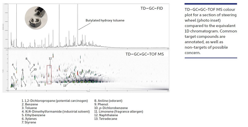 The figure shows the TD–GCxGC–TOF MS colour plot for a section of the steering wheel cover with the typical target compounds – from regulated methods such as GB/T 27630 – annotated on the plot. Many of these target components would have co-eluted with numerous other compounds in the equivalent 1D separation, meaning that concentrations would likely be overestimated, or the target compounds could be missed completely.