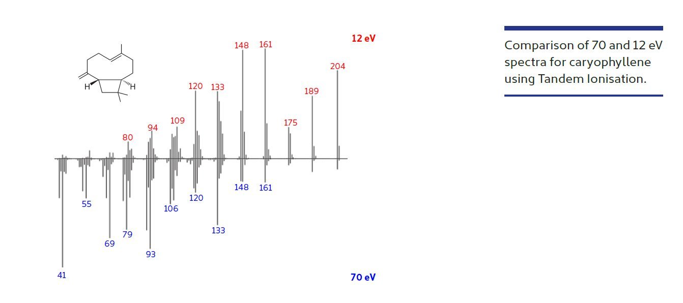 By enabling two sets of complementary spectra to be generated from a single GC or GCxGC analysis (as shown in the figure for caryophyllene), Tandem Ionisation allows complex samples containing structurally similar compounds to be comprehensively characterised.