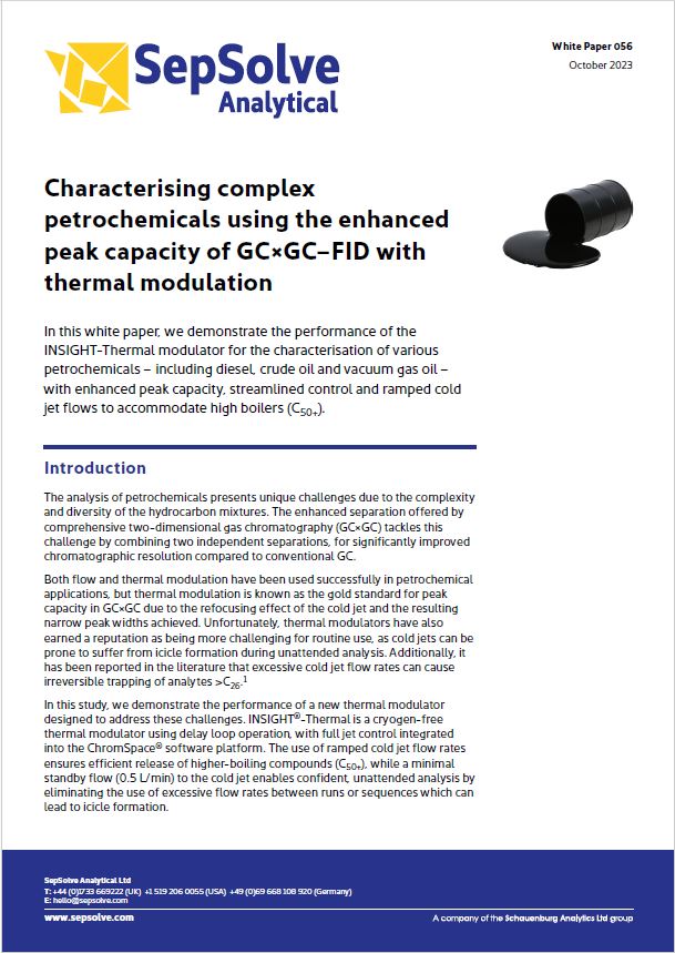 This white paper demonstrates the performance of the INSIGHT-Thermal modulator for the characterisation of various petrochemicals – including diesel, crude oil and vacuum gas oil – with enhanced peak capacity, streamlined control and ramped cold jet flows to accommodate high boilers (C50+)